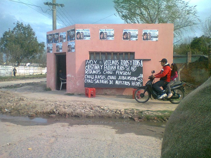 Its a polling station in a shithole town in Corrientes. It reads on a chalk board outside Today lets all togheter vote Fabian Rios and Cristina Kirchner....If not bye pensions, bye social security, bye kids salary